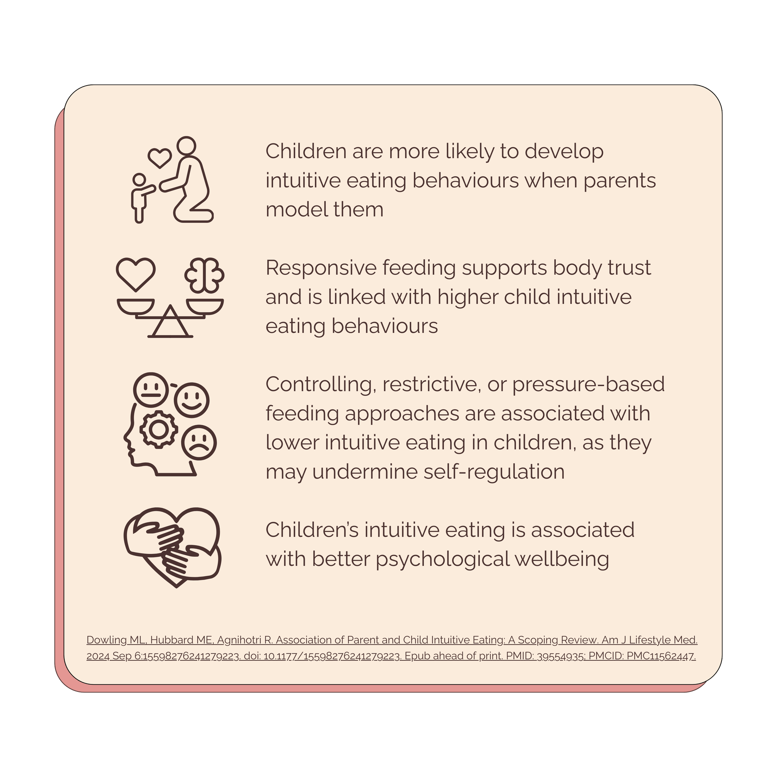 A 2024 scoping review by Dowling et al. examining parent and child intuitive eating behaviours found that responsive feeding practices are associated with higher intuitive eating in children and better psychological wellbeing.