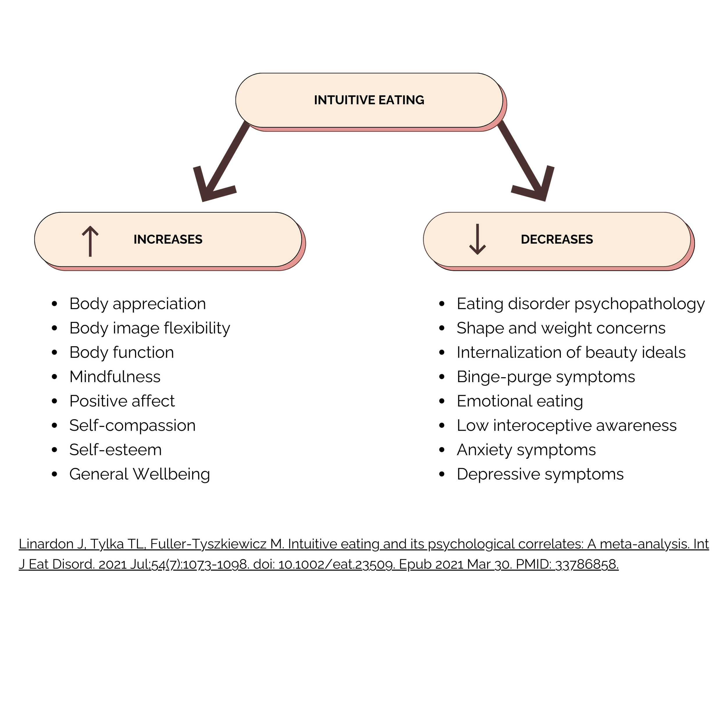 The strongest evidence relates to psychological wellbeing. A large meta-analysis by Linardon et al. (2021) found that intuitive eating is linked with: improved self-esteem, positive affect and overall wellbeing. At the same time, intuitive eating is associated with lower levels of disordered eating behaviours, preoccupation with weight or body shape, and lower levels of anxiety and depressive symptoms. See graphic below for further details on outcomes.
