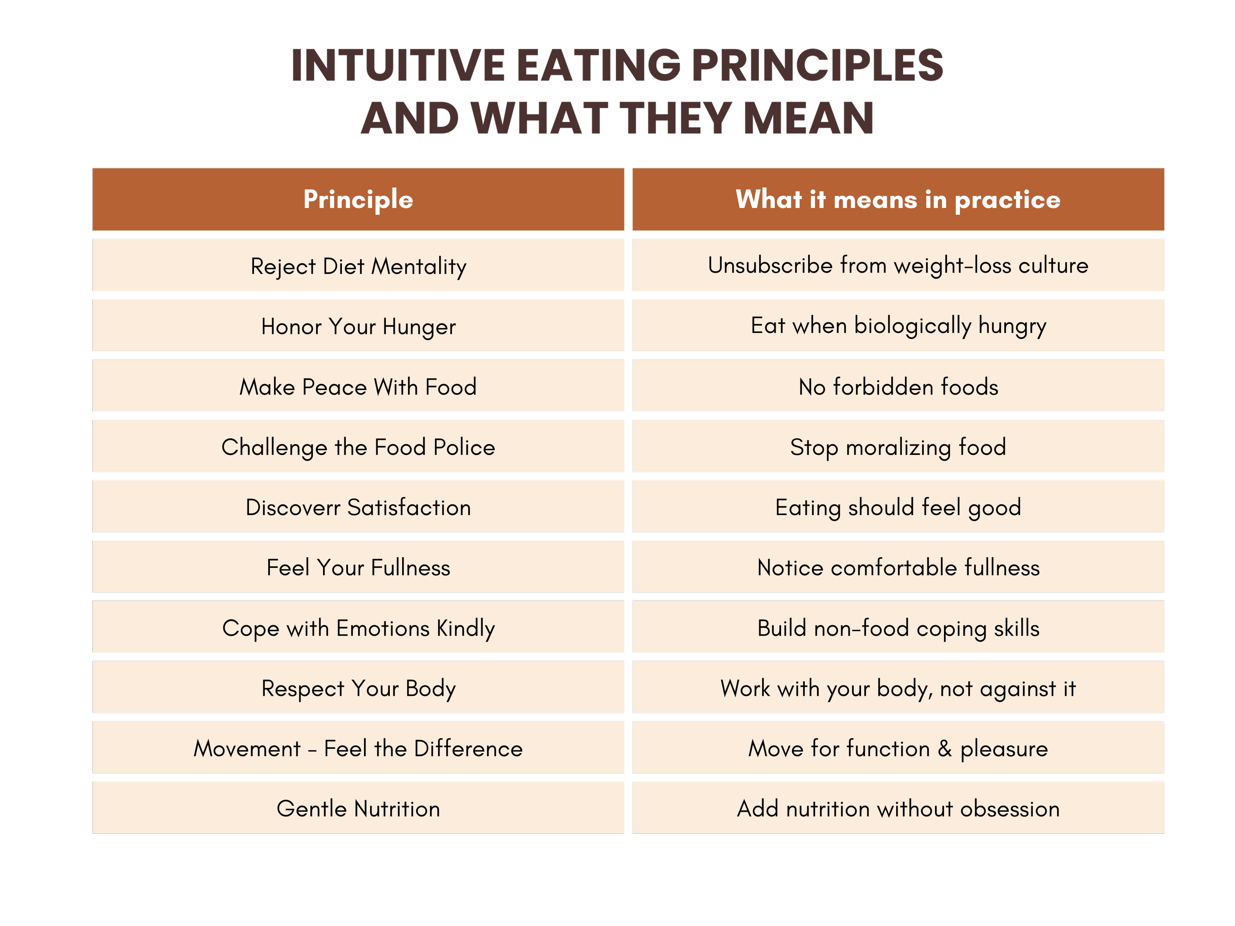 The framework is built around ten core principles, including rejecting diet culture, respecting the body, and practicing gentle nutrition. Together, these principles support both physical health and emotional wellbeing, while helping people develop a calmer, more compassionate relationship with eating.